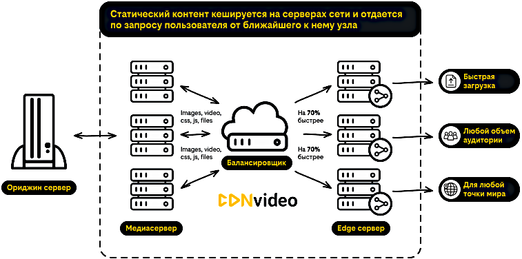 на серверах сети и отдается по запросу пользователя от ближайшего к нему узла